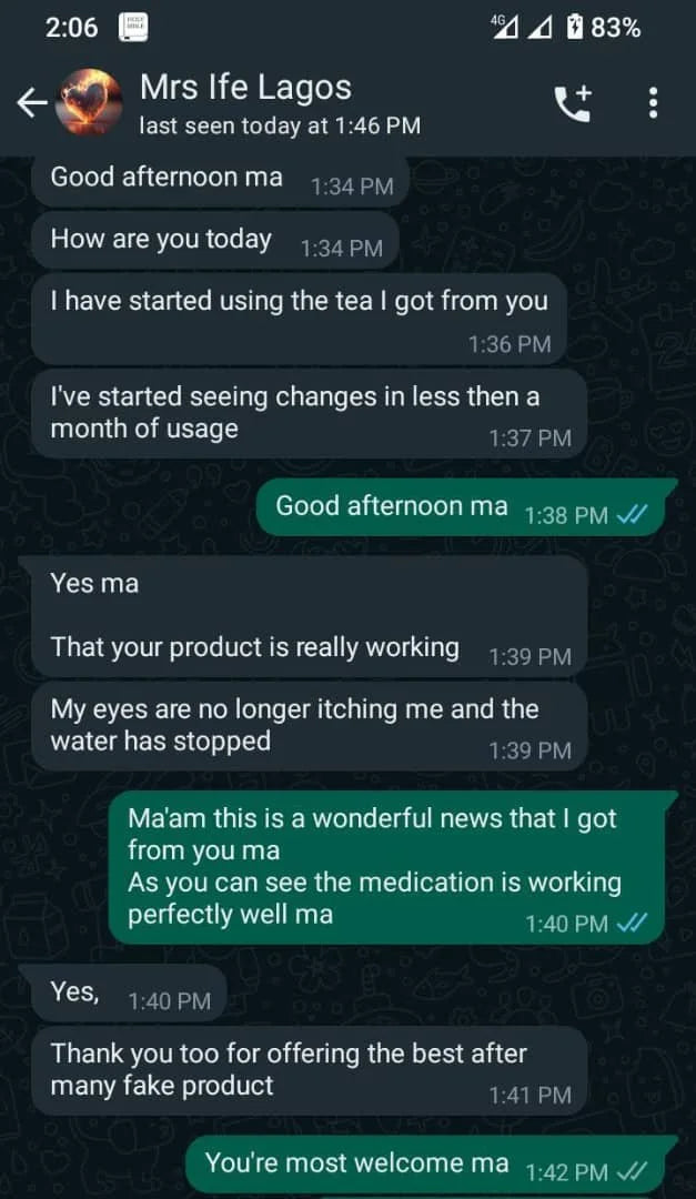 Ifeoma, Onitsha Aug 2025Verified Buyer“No More Red Eyes”"My eyes were always red and irritated. After starting this tea, the redness reduced and I feel much more comfortable every day."